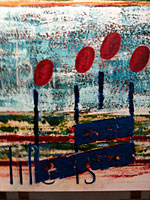 This is a bad photo because my camera is not available and I had to use a camera phone.  Not much to look at, besides showing that progress is being made.   There is a depth to his painting that just cannot be seen… and I regret that… for now I am stuck.  Things are certainly evolving.