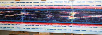 Tonight, It was easy to drift  away from the main color band:  the Mark Rothko color band  look.  Sometimes you have to let a part of a painting set in, to make sure to not over paint.   So, on to the four other narrow color bands.    Then it was back to the main band to create a better transition between the top and bottom edges and the rest of the canvas using a magenta color.
