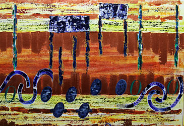 Image fragment of a 24″ by 8 foot painting  ( Just a reminder).   The ties and the beams came together tonight like never before.  Everything builds on the past, yet sometimes two ideas or two ways of doing things can add up to something that is three.   Art always moves in threes.  Tonight this painting gain a 1/2.