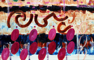 Fragment left lower side.  Originally the first coat of this whole group of notes was a cadmium red light.  But the color quickly felt out of place. The vast middle and right side of this 14 foot canvas are notes that move from that red to magenta and then a cobalt magenta mix to finally the right  and viridian. This is being discussed for although the light red has now been painted over with magenta, it still exists, on the corners and peeks through here and there.  The point is that whatever is painted is rarely done in error: decisions  are made and refections change and like in pin ball the artist bounces about until the painting finds its way.  The bouncing is never organized, nor consistent, and guaranteed only one thing: with each kick back a new opportunity finds its way forward, never to be lost.   That was guaranteed  to happen as soon as that carefully planed cadmium red was thoughtfully stroked and spread precisely on the canvas and just as carefully covered over,…mostly.