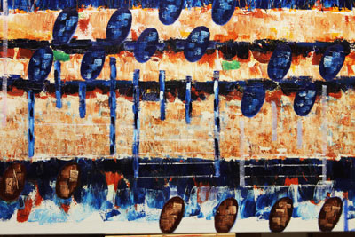 Been a few days with summer and all, but unlike smaller canvases this 14 footer takes considerable time to see leaps and bounds of changes. What you see here is more thought then progress.  There is going on a constant comparison to Long & Winding for that one days adventure broke new ground, and pushed things forward way more then was ever expected.  But, as has been learned from the pass, there is no real duplicating of the techniques from a previous work with the current effort.  Yes, those tried techniques are attempted but somehow they never fit the same.  This causes frustration and eventually something happens, usually accidentally, and the way forward is found.  It has been that way for the last five years.  The day that ends, the day there are no more accidents available, will  stop everything.  The wall will loom;  the choice will have to be made, not accidentally.