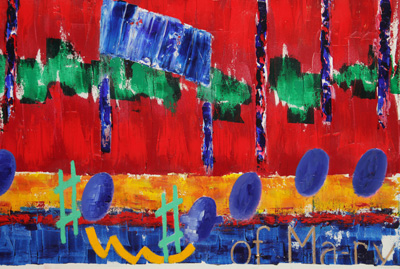 What Child is This right side.  The notes have gone from a pink rose to ultramarine: blue just seemed to make this canvas work better.   The Christmas painting is approached not as a cutting edge project but more like a summary of this last year.  Yet, What Child is This is more of a slower more thoughtful tune, and yet, what you see here is a lot of movement and colors that are bright; probably too strong for this music. It could not be helped.  When thoughts turn to the Christmas project the first colors that are seen are red and green.  Maybe, What Child, should have been done with softer yellows, browns, and pastels; but obvious that did not happened.  Sometimes, the art deviates from the music.  In this example it is quit apparent, and yet, no apologies are coming for Christmas is a joyous time and this music needs to a new cover that picks up the pace.  Hey, it is all about tempo.