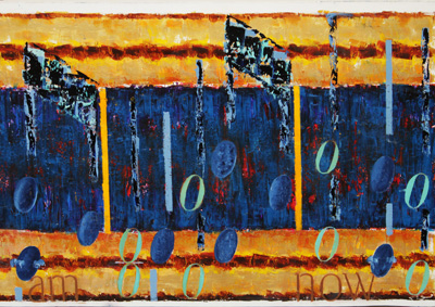 Looking at this section of this artwork, the only words that are appearing are “am”  and “now.”  They where originally drawn using the color Alizarin Crimson.   They looked nice but created to much color bounce needed for this music.  Regrettably, they where removed and drawn again, this time with a Copper acrylic, that does not show well in this reproduction, but whose appearance better matches the flow and mood.