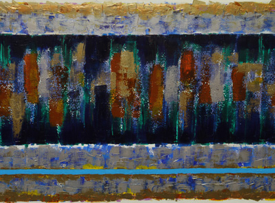 Ev’ry time we say goodbye, close up of the finished base.  The base: the background, the stuff that fills the voids between the notes, has, received more attention that grows in importance. This means that the emphasis, only of the notes, that originally started this journey has widen out.  Actually, with the original music work,  the notes where put down across an unfinished self-portrait, creating two points of interest.  This was a one time idea that quickly faded to backgrounds that where painted to accent the notes.  Increasing, over time, the focus changed to where the background was finished only when it could stand on its own, without the notes.  Today, the background stands as an abstraction and because of Van Gogh’s influence, the base is seen as a landscape or a portrait, and the notes have become points of interest, that all together celebrate a most wonderful, which is music.
