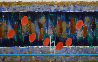 Ev’ry time, the notes all placed across the canvas.   This was a challenge this time to get all the notation to fit.  You find a phrase of music that has potential. Then you count notes, accidentals, slurs and ties.   Then, you divide that into the length of canvas, hopefully a canvas that is available. That is why a lot of this music is composed of multiple panels.  The available inches per note gives a good idea of the size of note that will fit.   A size is picked and then it is tested to see if  the notation will fit with space between.  Not just across, but what height of canvas will be needed becomes the decisive test:  where do all the notes fall?  Many of these works include words and they to must be worked in there proper placement, which with this canvas caused problems.  The spacing, not enough or too much left,  was not correct and the notes where entirely removed.   A number of other times multiple notes where removed because the text would not fit, which added to further progress delays.  Things are fine now, with an interesting point, that twice the entire notation was moved to different positions from the original plan.  Each work does this.  They are smart and demanding which escalates quickly, and there is nothing that can be done except find the way,  their way.