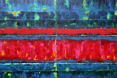The part holding back the move to the notation is the large red movement that represents the look of a staff.  Last night half a dozen different and repeated colors were tried: some stayed on and some where washed off.  In the large band of red you see the colors: Quinacridone Red-Orange, Naphthol Red Medium and Red Light. Cadmium Red Medium and Red Deep Hue, Pyrrole Red Dark, and Medium Magenta and Acra Crimson. That does not necessary make this work better, it just a visual show, in the paint, the struggle to get it right.