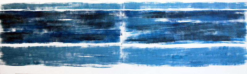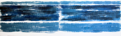 Hallelujah  is a 3 foot by 10 foot canvas.  The thought is to use narrow, across the canvas rectangles, with different shades of blue to create some base interest.  This canvas is hard to photograph because there is not enough room to backup and have the whole image in the picture.  This image was shot at an angle and the perspective was fixed in Photoshop.  Usually these preliminary images are shot with a add on Canon Flash, 580, but with this image there is going to be a need to light the far side better.