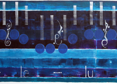 A couple of  nights before there was only empty circles, and no idea what color to use to fill in.  Then the next night, just walking down and looking at the canvas the obvious color choice of  Cobalt Blue was chosen, over Ultramarine Violet that lacked cover.  The Cobalt worked for two reasons, it stands out from the background, but unlike a lot of work in the past, it also lifts the canvas gently from the background forward.  That is important for this music.   The idea of strong separation or contrast, notation from background, can work with some music, check out Chopin’s Valse.  This music demands a smoothness of flow, and an overall picture that bonds completely  with the viewer.