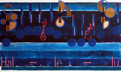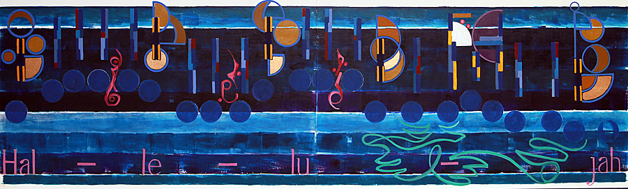 Modest update for Hallelujah a 36 inches by ten feet two panel work on canvas. Spent two evenings trying to decide what colors to use for this musics one word, Hallelujah. The first color was Burnt Sienna, and then no matter what dark or light shades of Sienna that were used, it just did not look right. Even trying the other brown colors, failed, so then the shift was to the acrylic Green Gold at the end of last night.