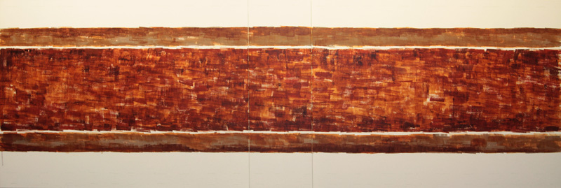 This work is three panel: the sides are 3 feet by four wide, with a center one foot wide by 3 foot tall. The base color are Burnt Sienna, lightened Burnt Umber, and Transparent Brown Iron Oxide, with a little Red Iron Oxide.