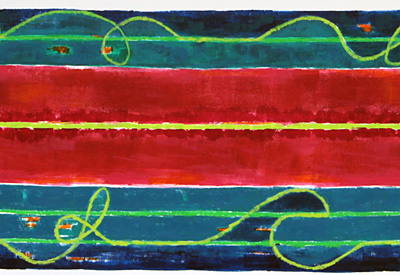 Now, what are we looking at here.  It is a convincingly honest attempt if you understand that each of these works demands uniqueness.  It is a wonder that as this art matures that so many options find there way to the canvas.  So what we see here new is a representation of  the horizontal lines and spaces of a musical staff.  The swirly lines are also a representation of the horizontal lines and spaces of a musical staff.  This is a take off of the evolution of the Slur and Tie in this art. Sheet music has its rigid rules, but this art is flexible,  while staying true to the rock solid flow of the music.  That flow ties this art to a particular piece of music.  But from there, this art has little in common sheet music. So keeping the musical flow is a must but everything else is up for creative expression.