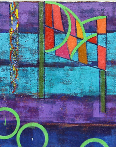 That moves this art away from the abstracted beams. Since the method of using abstraction in this art, has evolved from a number of other previous attempts, it was thought that this could be tried on the lone stems. The thought was by creating little vertical abstractions, this would add interest, and variety to this canvas. The issue became apparent, stepping back and looking at the entire work: that the two different shaft designs interrupted the flow. The advantage of consistent stems is apparent in the simple straight forward look and design of those green shafts in L’Estro.