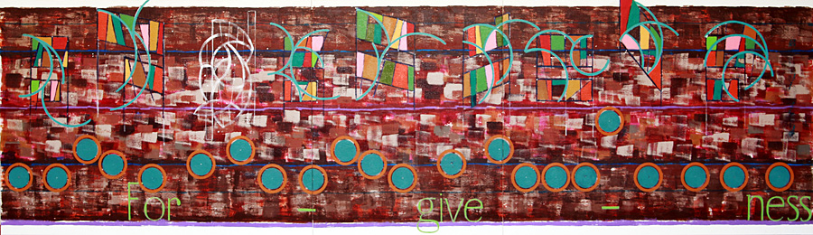 The choice of one word was done for two reasons, the three syllables offer an opportunity in design, along with the fact that it sums up the meaning of this music. Not sure of the color choice for letters, but brown was out and so was anything that look anything like a blue green combo. This green does work for starters, but, as usual, the letters will need more shaping to make them stand out to better match the meaning of the word, forgiveness.