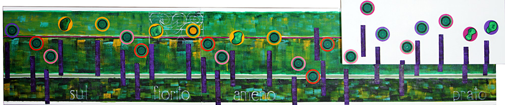 Vivaldi’s Four Seasons, Spring Largo about 120 inches (3m) long and for the most part 24 inches wide. The Italian words chosen from Vivalidi’s Spring sonnet are, “the pleasant flowery meadow,” using Google translator. Other translations include “On the flower-strewn meadow,” “..the meadow, in full flower,” and “…the flower-rich meadow.” You have the choice to pick your favorite. Anyway, since these sonnets are almost 300 years old, and languages change in meanings over the years, who really knows what the correct English translation should be?