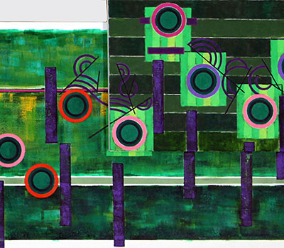The different colors for my notes work well even though the bright colors are only on the outside. The thought was to have them represent a variety of spring flowers. Painting the insides with more common varieties of greens, slows the movement down and locks them in with the background. The words speak about a pastoral of spring flowers.