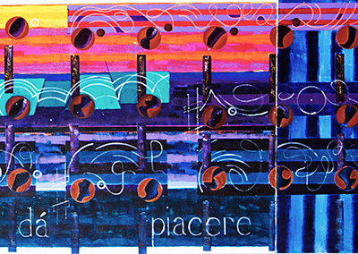 Also, I get bored using the same identical techniques in a work. Of course repeating a style, lets say from one half note to the next, gives an artwork a smoother flow and comfortable feeling of consistency, and has it need and place. But again, it becomes tiresome, and maybe disappointing at times, and that is when those little tweaks appear all over the canvas. Call it this artist take on music in Cubism. The large extent of styling in this work is because this canvas is uniquely describing three different instruments: the top flow line is the Principle Violin, while the second is the Primary Violin, and the third is the Cello. The desire then to give each instrument its own look, which leads to different ways of applying paint.