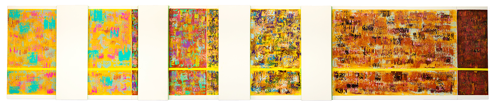 The most difficult panel in this group of panels, so far, has been the small canvas attach on the end.  My artworks read from left to right.  I keep applying colors with my home-made squeegee, and that panel, just got uglier and messier.  Finally, I scrapped off some of the layers and rubbed in some color, and called it good.  The next day I was looking out the window on the woods floor, now clearly visible,  and what I saw is what I painted on the far left panel. The end of fall just gets strained of most of its color,  and in my Vivaldi world that color it is a deep ugly.