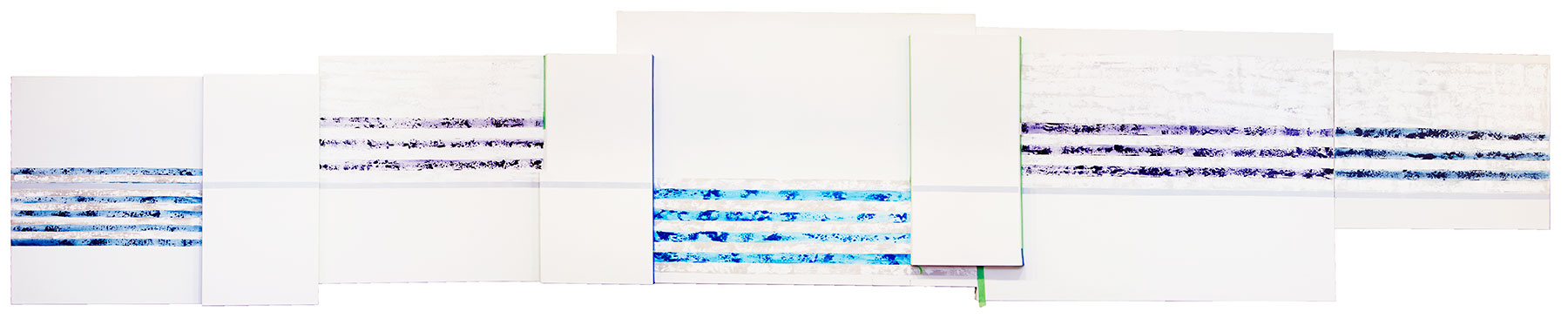In the photograph you are not seeing the contrast between the stripping and the background where I first spread a light gray layer. Over that I then pulled across multiple thin layers of pure white. I am using an image of pure white snow, in this artwork, for we have received plenty of that, lately. My challenge, with this work, is to display this feeling of fresh snow cover across the entire seventeen feet of canvas that is Winter Allegro, creating diversity and multiple areas of interest.