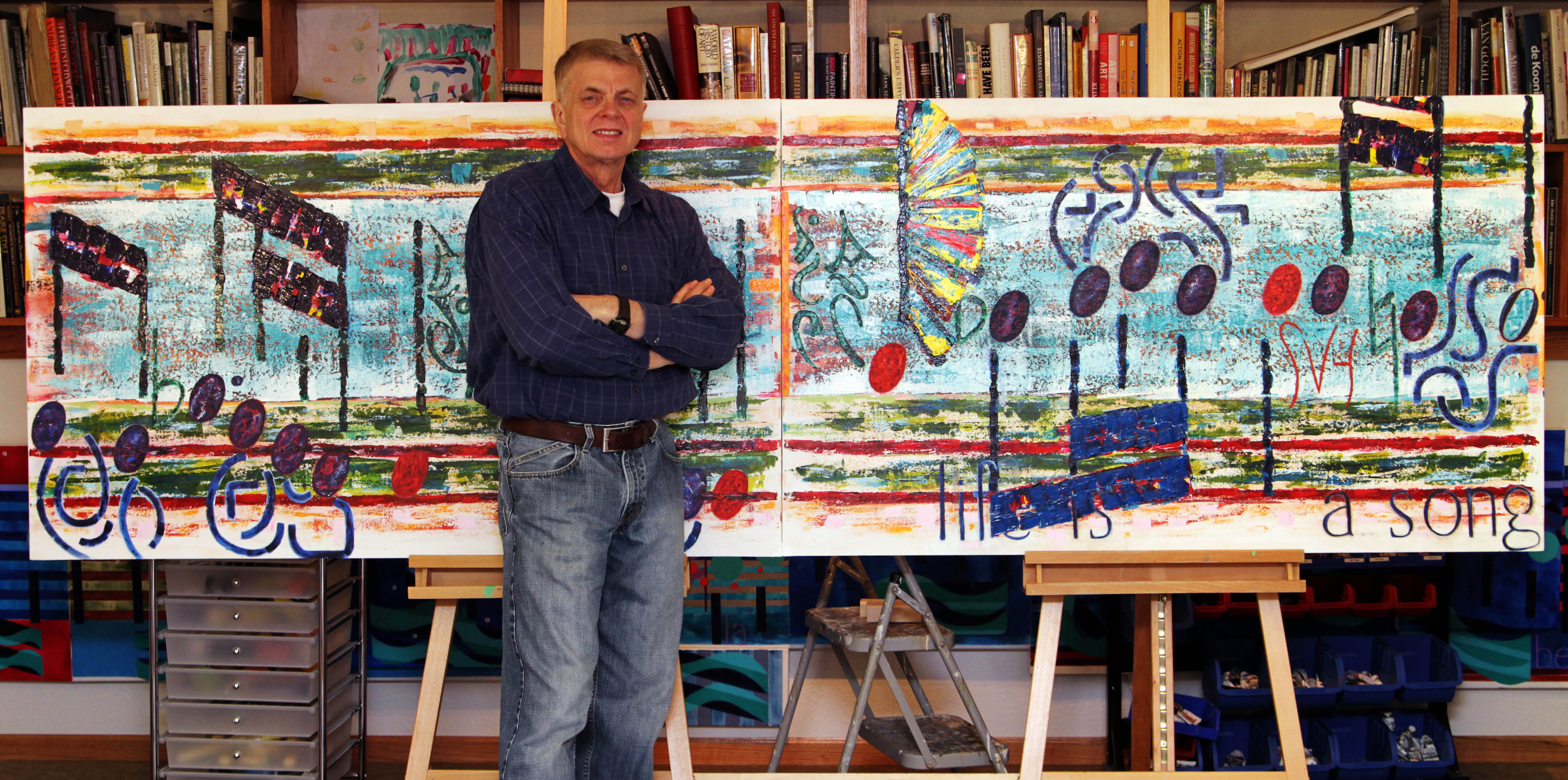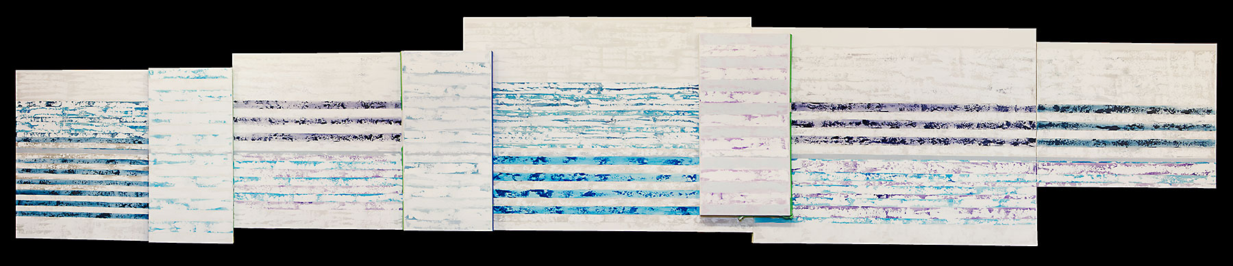 WinterAllegro3Image2 Vivaldi’s Winter Allegro consists of  eight canvases that vary from 15 by 30 inches to 36 by 48 inches in size. This is the eleventh in the series of thirteen artworks of Vivaldi’s The Four Seasons. Again in these images I am not capturing the look of this work. They look flat in contrast and color.  You have to see this work in person  to believe this difference. Looking at this completed background what I see is what I am living in: the chill of winter. At 17 feet in length and three feet high, standing close to this work all that is missing is the chill in the air that makes each breath feel razor-sharp.  Standing near this work it is winter, no matter the season.