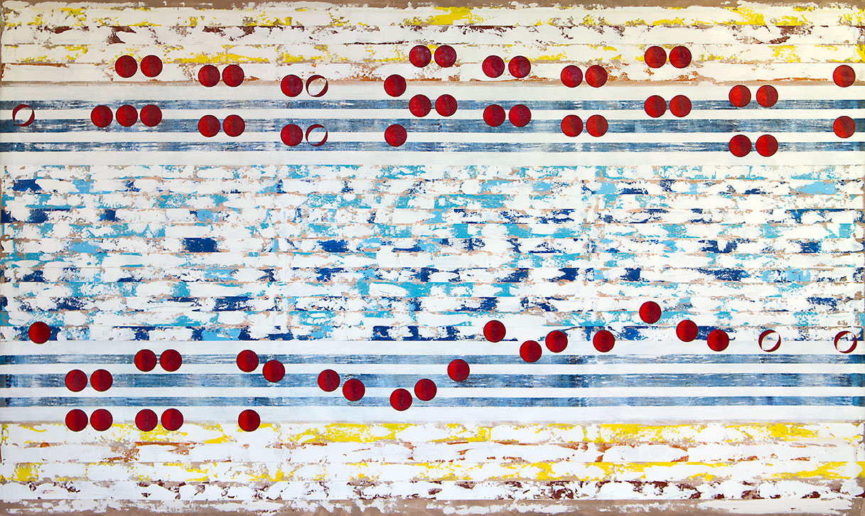 Bach Sonata BWV 1014 Adagio, with this image showing the musical flow.  I really like this stage of this artwork. You have the painted background and just above it you have the music floating across the canvas.  In the beginnings the music flow resembled musical notes.  I quickly began to elevate my  notes, giving them more stature and a greater dramatic look.  The problem with that look, even when they where almost  vertically, was that they still resembled  sheet music notes.  That changed when I moved to the circle.  Now, that I have shaded these circles, I have noticed a new sensation.  I see the music flow, but I am also seeing much more: I look at the music as it flows across the background, and what I now see are little moons.  It is almost spiritual, looking at the musical flow and seeing something else totally different form music, but still bound to it.  I am not sure where this comes from, beyond the fact that as a boy I followed the space race with Russia, and knew all the names of the planets that revolved around the sun.