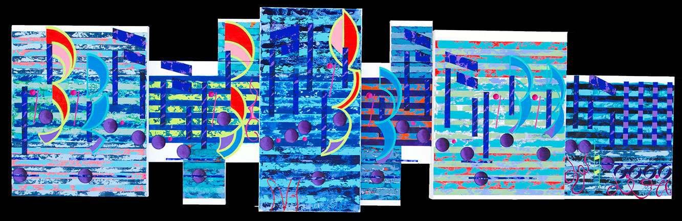 You are looking at a work that evolved from its original ideas. What the original concept, creative plan, or art mission was I am sure of one goal of this artwork: I wanted to take the background from the obscure, supportive function, to where it dominated the artwork, with multiple layers of colors across stripping that covered the entire work. Than I wanted to see if I could use the music to push back against the colors and visual impact that it was covering. Surprisingly, I had to return to the background and repaint parts of it, to finally give the music the visual appearance I decided it needed. When I applied that yellow-green stripping, on the second panel, this work finally began to come into focus. On my sixteenth notes, I used a bright red to add the punch that comes at those points in the music’s flow. That helped considerably to pull the viewer’s attention to the music, and away from the background. In the end the battle between background and music comes down to finding a balance. I only know when it is there, and it is obvious when it is not.