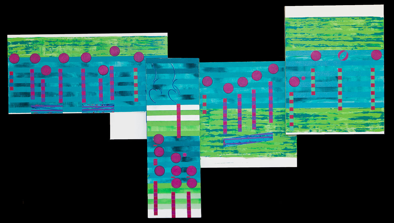 The big issue with Love is all Around is the struggled I have had with the staffs of this music. Usually, I spread light colors over a dark background and quickly finish the staffs. That idea, although, did not seem to me to fit this work. In the past I have used little boxes of contrasting colors for my staffs. You can see a lot of this technique on the great painting Autumn Allegro 3rd movement Vivaldi. I also used this same style for the ending notes of the Take Five artwork. I am guessing I carried over that influence to this work. My problem became my color choices. This lead me to repaint the strips several times, which has slowed the progress over this last week and more. I am not sure if this will be the final changes to the staff colors, but for now I am moving on.
