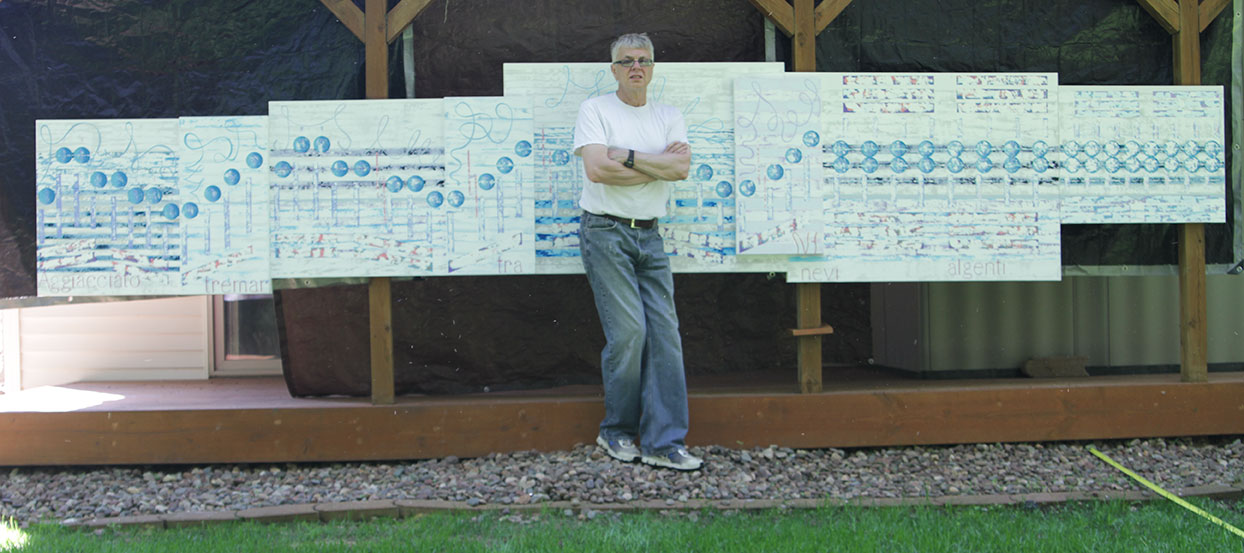 Vivaldi’s Winter Allegro Non Molto.  This was a forever painting. Forever to finish that is.  Soon after I took this photograph, with Barbara’s help, we placed it in front of a large stack of canvases.  Because it is over seventeen feet in length I could not hang this artwork.  I am not sure if I will ever see this work on any wall. That is the way it is. This large artwork is a part of the lengthy Vivaldi Four Seasons art series.  Now, there are only two more paintings that I need to create.