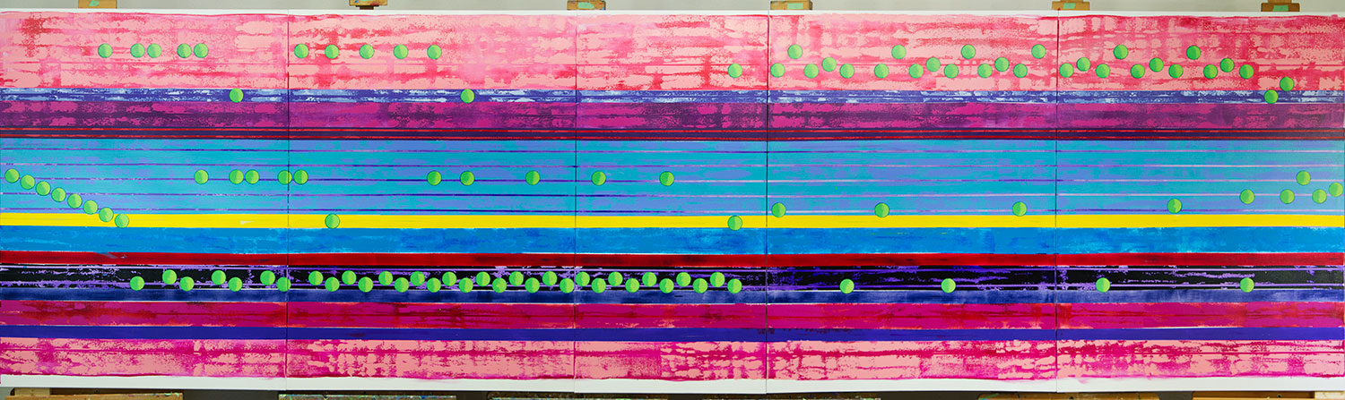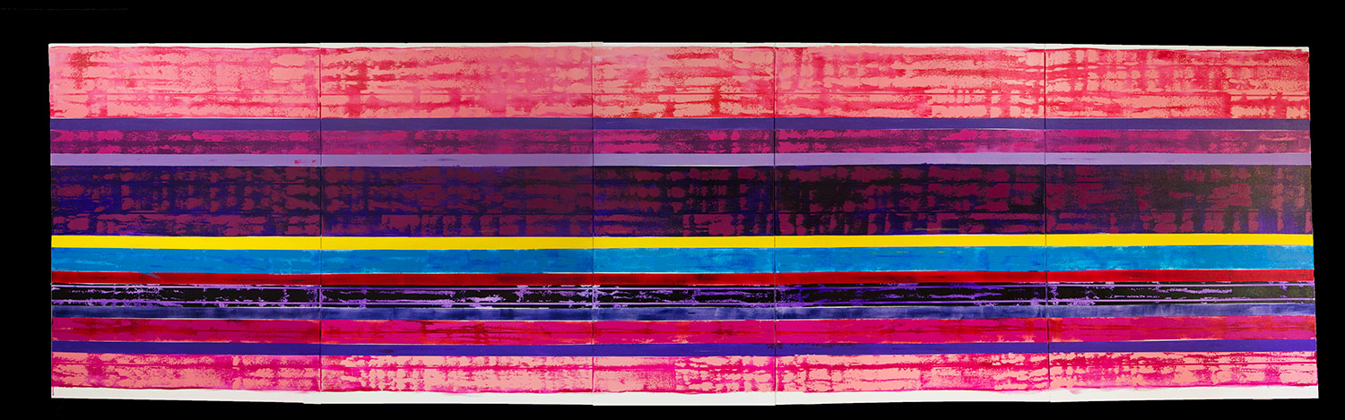 Background Image 1 July 4th. This painting is the twelve in this series Vivaldi The Four Seasons. It consists of five canvas panels. The total length of this artwork is fourteen feet by three feet in height. In this background I tried to show the colors of spring where I live. Since Spring, again, was short, and lack the emotions I use to attach to Spring when I was younger. Now, when I think of Spring I think of April and May as our two best months where storms can easily become tornado warning. In many emotions I dread Spring. This year what there was of spring came late. I thought way late and to me Spring was an afterthought. But when it did come I saw it in the blossoms of the crab apple trees, the smell of lilac bushes, of few rhododendrons, and if you travel into the country side plenty of Golden Rod. That is it for Spring. And some of those colors, Purple, Rose, Pink, Violet, and Yellow, are what you see above.