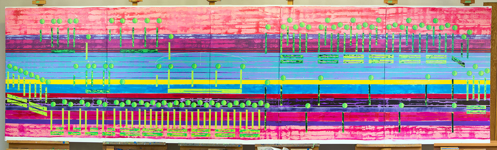 Vivaldi The Four Seasons, Spring Allegro. This large work 36 inches by 14 feet and I have completed the basic flow of the music.   Now that the music is all in place, those aspects of music notation that I consider the interesting part of the music, are up next.