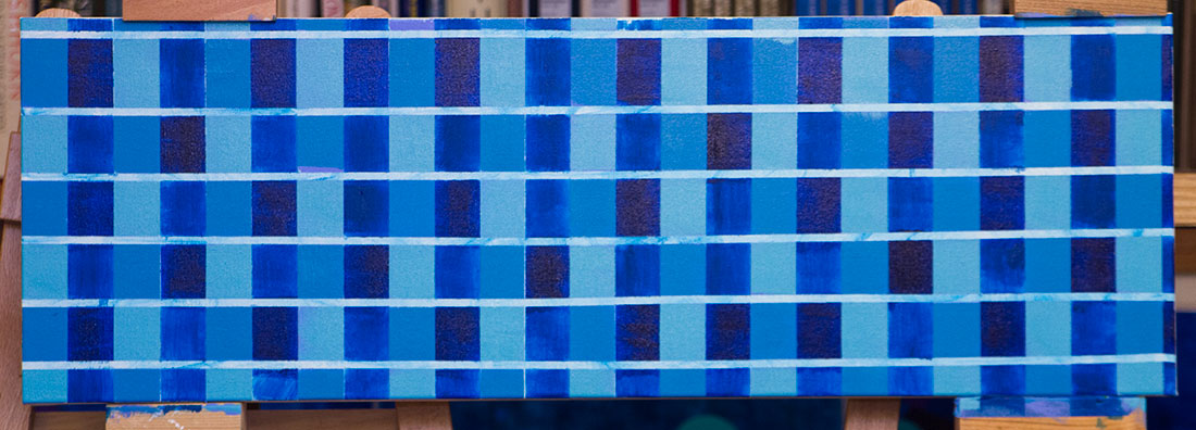 I should mention a stylistic change the occurred  in the look of this background, compared to pretty much else I have produced. Actually, on another artwork I am working on the same time,  I painted the background in strong vertical blue shades, to match the beat of the music (more on that work tomorrow). I thought the up and down stripping  looked so good on that work, that I thought why not use it in a more modest form on this artwork. That also turned out nice. Interesting, how fluid a style can be if it just let it flow.