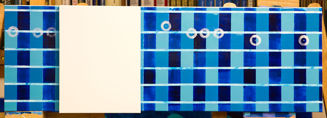 I do have a number of smaller canvases, but not enough variety to use for a small work.  For now I need to build artworks from what I can find that is already stretched.  I do not have the time to cut and stretch custom sizes. And even though I do have thirty-six different size stretched canvases in stock, the smaller the overall artwork, the smaller the options. That  was what was causing my problems with this artwork.