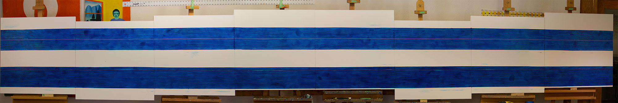 This is the last great painting of The Four Seasons, that I started in March of 2012. When finished this series will consist of be thirteen paintings in all. You can see the previous Vivaldi Four Seasons works at this Page. You can tell by the enlargement, of this first image, that this is a large painting. It consists of eight canvas panels each thirty inches by thirty inches, for a total length of twenty-feet. This is certainly the longest work of the Vivaldi series, and very near being the largest in the group. The length of this work quickly adds up when you consider that the 64 painted strips, in this first image, total 1,280 feet of paint.