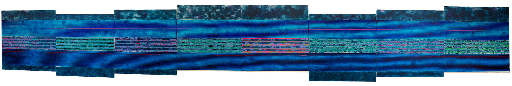 Summer Presto from the Vivaldi Four Seasons series. Composed of eight panels each thirty inches, this artwork reaches a length of twenty feet. What you are seeing is the background completed, for now. Blue dominates this artwork because the theme of this movement, from the Summer concerto, is a storm. Along the edges I have created the forward and backward flow that appears in the clouds of an approaching storm. The narrow strips in the two wide bars of color is where much of the music will appear. Then between the music I again have gone with another back-en-forth created from using two different patterns. This neutral area does then add interest, drama, and variety to the artwork.