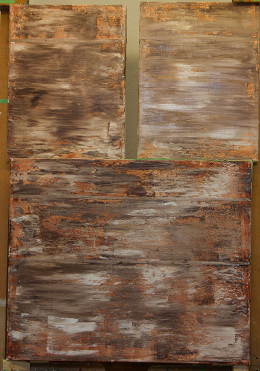 This is the artwork, No Rain, a tribute to the music of Blind Melon. This artwork consists of three panels of stretched canvas. The largest panel is 20 x 24 inches, and the two smaller upper canvases are each 12 x 16 inches. What I have done special here is that the flow of the music will be from the back canvas to the most forward canvas. It is hard to see in the image, but the upper left panel is two steps back, while the upper right is one step back, from the larger lower panel.