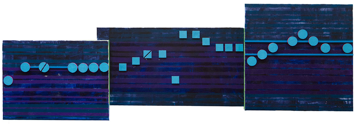 You are now seeing the flow of the music for It’s so hard to say Goodbye. For the music I have used painted wood, both round and square shapes, about a quarter-inch thick. I am at a turning point with this artwork. As I have done with other artworks I have created a three-dimensional look by stacking canvases. My thinking is to take this further by moving entirely away from displaying the music as a two-dimensional shape. This approach then sharply separates the Music from the background, and better satisfies a constant pursuit of mine.