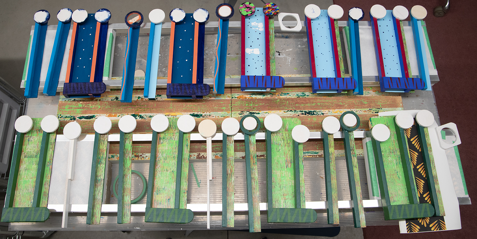 This second staged image of Africa, shows the music laid out on the background. In the past I would build these artworks one section or piece at a time, and then mount what I had to the background before moving on. With this artwork, similar to the Christmas painting, I am constructing and painting all the parts of the music before attaching anything to the background. This saves time, but doing all the construction at once can be tiresome, repetitive, and show little progress. Having all the pieces available, does cut the stress of making sure everything fits in predefined background. What stays the same, and is consistent from the very first music artwork, is that I add the music to the background from left to right.