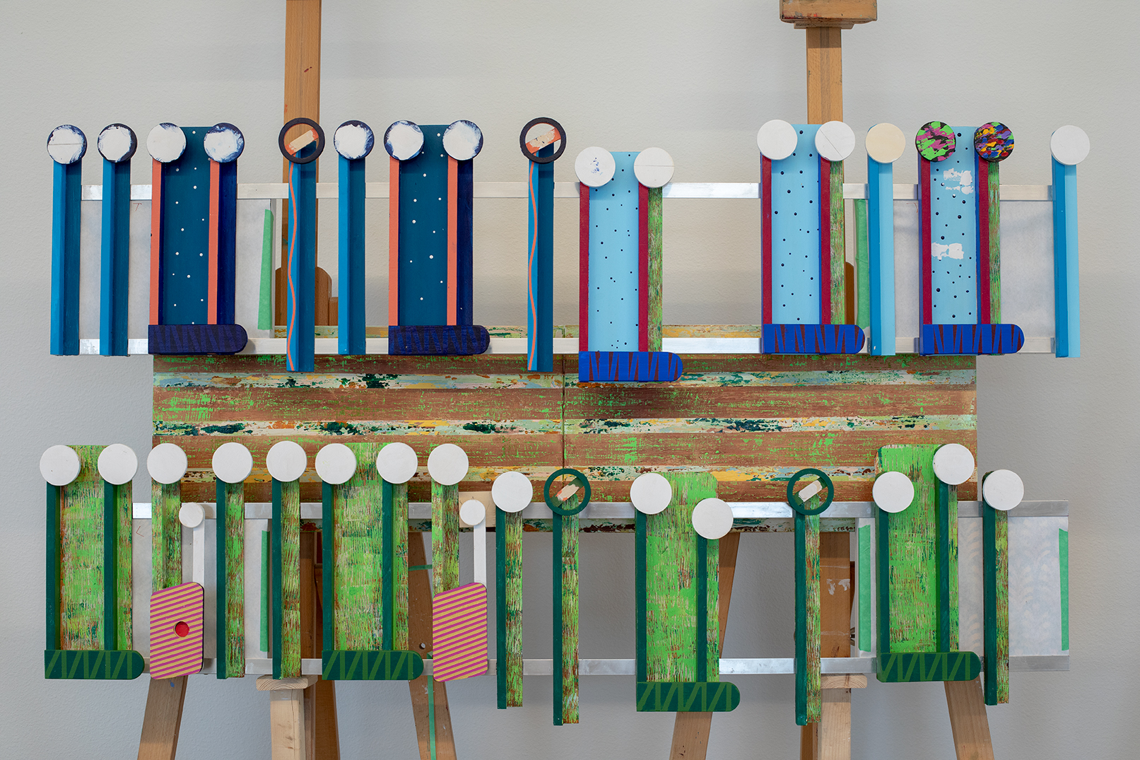 This third image shows the upper and lower music mounted to the background. Drilling holes and screwing canvases together brought back memories of Vivaldi’s The Four Seasons Artworks, and the care needed to support and align canvas parts correctly. I had the easier option to attach the top and bottom canvases to the top and bottom edges of the background, but that looked too two-dimensional. The top section theme is the night sky and the day with rain falling. The lower music color theme is the Serengeti, along with the eventual addition of mount Kilimanjaro.