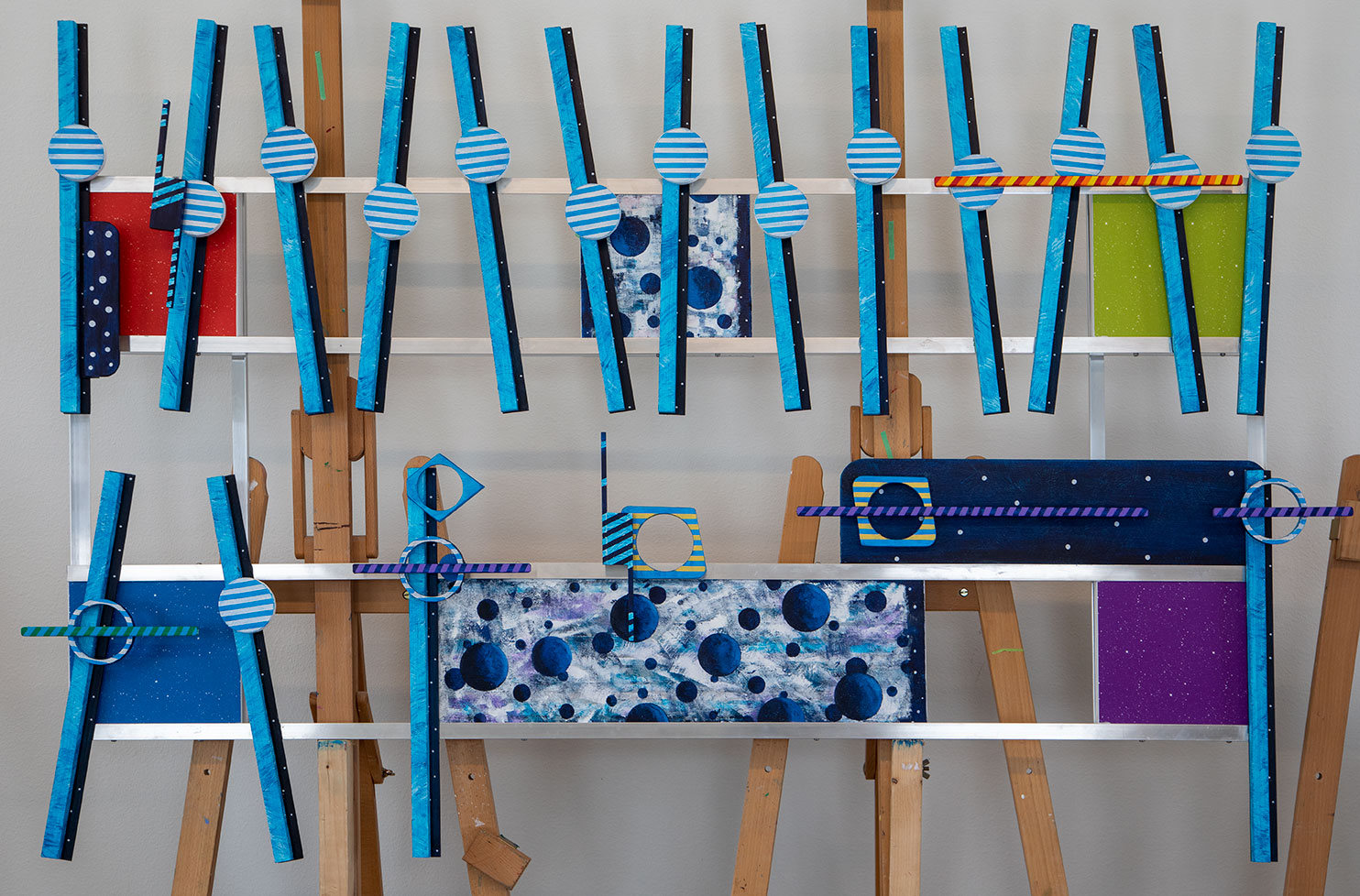 What I need to do is to connect the four outside canvases (covered with digital canvas images) with the two inner canvases that I painted.  In Giant Steps I had this same issue, but reversed, with the painted canvases on the outside.  Giant steps had the advantage that my painted canvases and the digital images on the other canvases were similar in design and color.  From a slight distance, it is hard to see the difference between them.  In this image of Rainbow, the difference between the digital images and the painted ones is obvious.  Somehow I need to change the look of these six canvases in such a way that they connect with each other.  Or not, and I could just call it Art.  But that would not be, this Art, where harmony is part of the visual experience.