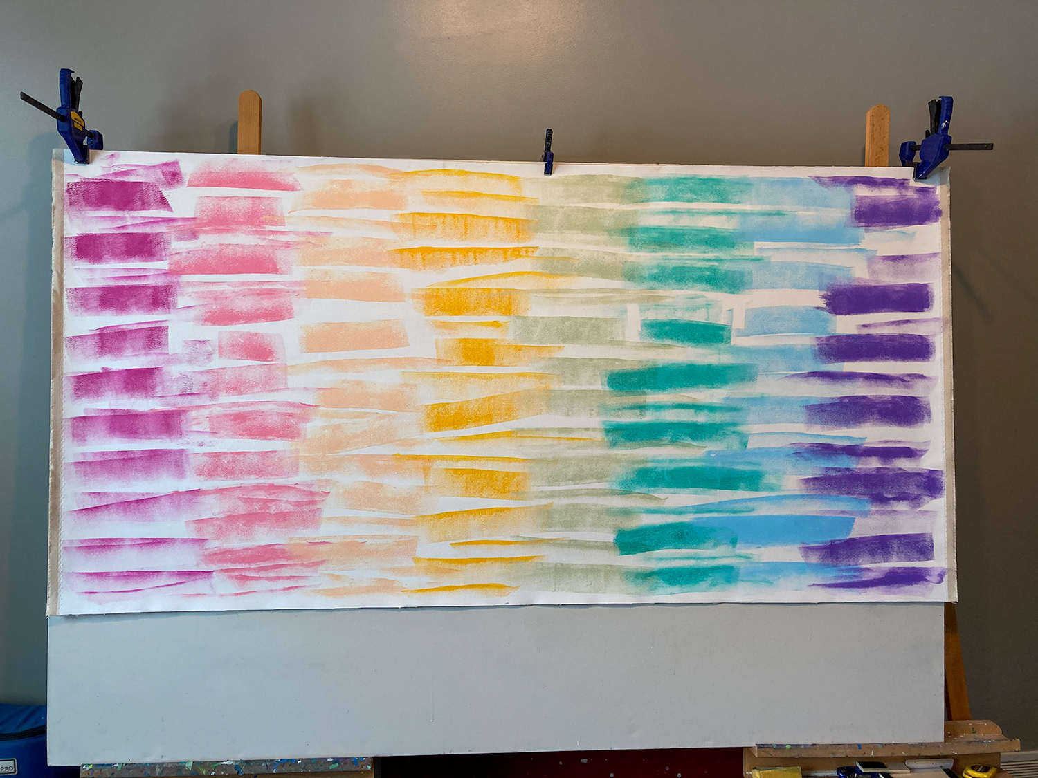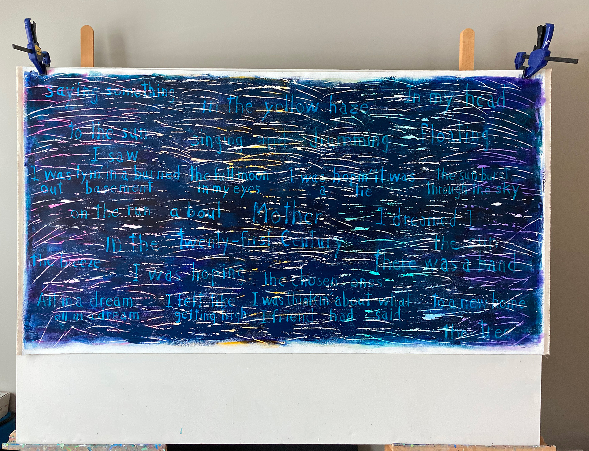 This artwork had the issue with a lot of tiny breaks in the topcoat before scratching.  These little cracks in the surface paint have existed from work to work, although in this project they seemed excessive. That is something I would like to see less off.  I have an idea that the use of too much water when applying the topcoat may be causing more of these tiny cracks to be appearing.  In some areas in the middle, I did not like the placement of the words, so I painted them over which did fill cracks.   Then later, when I took a pallet knife to the topcoat, those thicker paint areas proved to be rubber-like and difficult to get any smooth flowing scratching.  You can see a few spots across the middle that the pallet knife resulted in the unexpected pulling of the paint. Thicker topcoats did not seem to be an issue in the past, but this time the extra coats were applied after the original topcoat had dried.  I did see that slightly curved horizontal lines created with a narrow head pallet knife, instead of using zig-zagging worked better for this artwork.  Finally, For the most part, I liked the effect of the background layer that shows through. This time I used a small roller to apply the background colors.  This technique is reminiscent of earlier artworks.  This look certainly may work for a future topcoat.