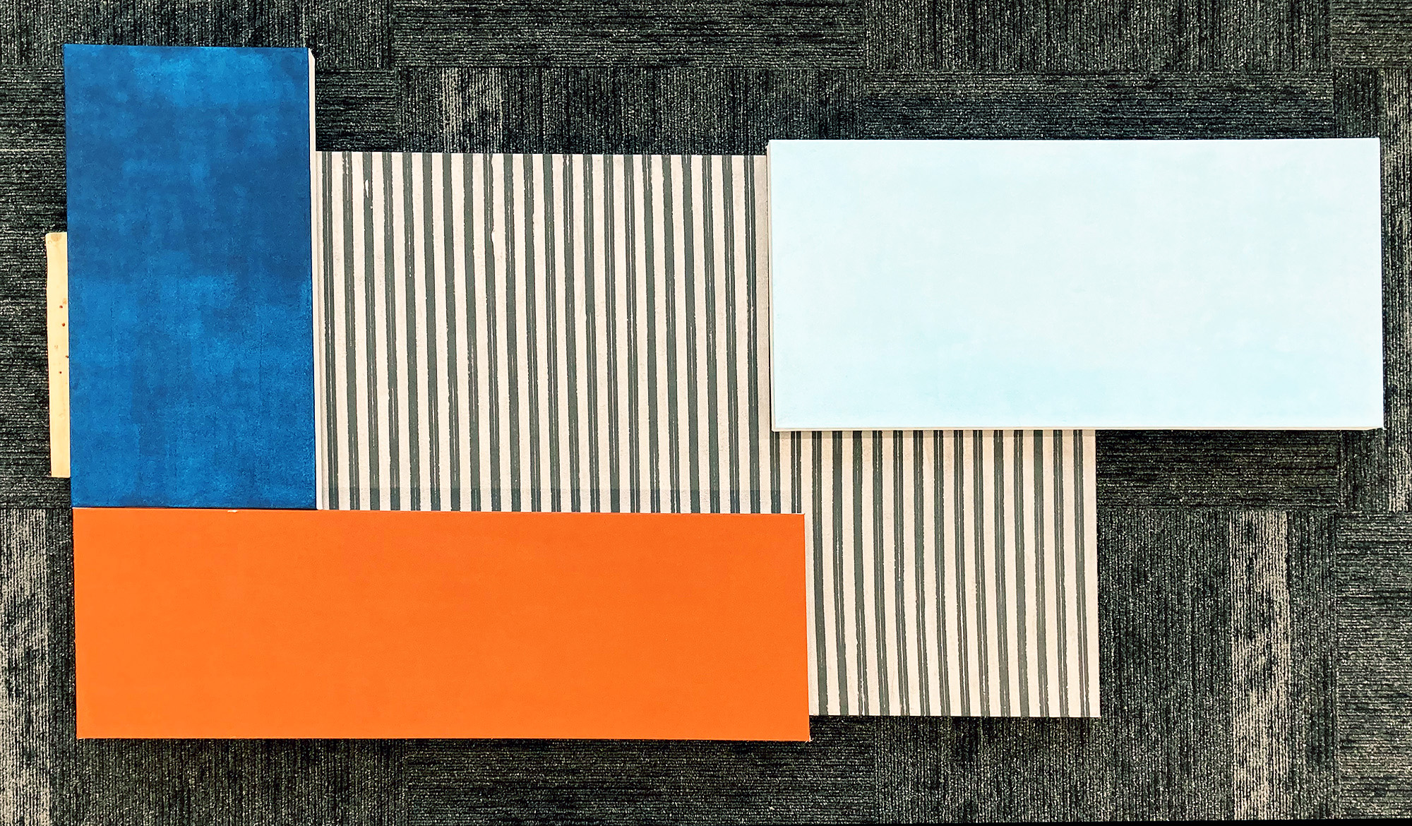 As for the larger blog photo, the colors and the design come from these Images from the LACMA Museum exhibition catalog, Frank Gehry. Not only has this art style been influenced by dead artists: Vincent Van Gogh, Pablo Picasso, Mark Rothko, Henri Matisse, and Jackson Pollock, it also has many other influencers, including the living architect, Frank Gehry. On the large canvas, the striping did not photograph well with the iPhone. The silver color looks awful, while the contrasting color is a lighter shade of black, meant to represent the Gehry image of corrugated metal.
