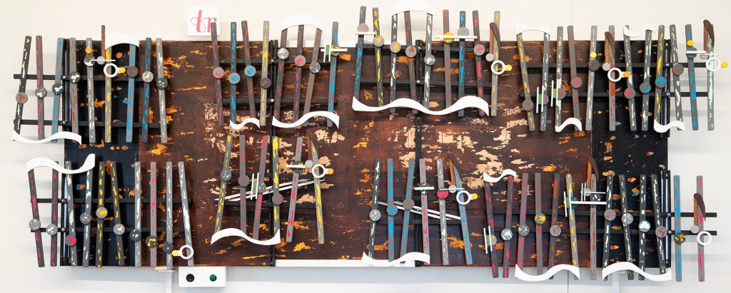Taking my current mood, the depth and style of the Bach’s work, and Gehry’s let-it-all-hang-out style, the results are in. Just another Day’s looks results from the largest canvas being painted like the look of corrugated sheet metal, the curving of wood pieces, and an eighteen-inch steel plate, resulting in an artwork with a depth of six inches.