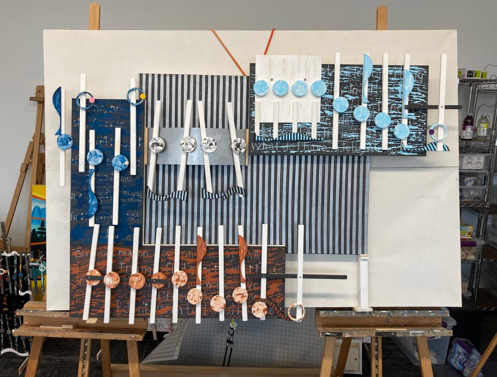 It was the CVA show the summer of 2021, that this Bach artwork got the worse of it, coming home with pieces of it in a tote. This artwork was a mess, and an irritation that I ignored for months. The worse issue was the mounting arms that pushed out the music a lot further from the canvas. This exposure and the weakness of the mounts resulted in more parts of the artwork being loosened or even falling off at the show and breaking loose on the U-Haul truck rental drive home. Eventually to store, I repaired the damaged from the CVA show. It surprised me I was only missing one small piece. Although still fragile to the touch, I took what I have learned since its build to strengthen the attachment of the artwork to the canvases.