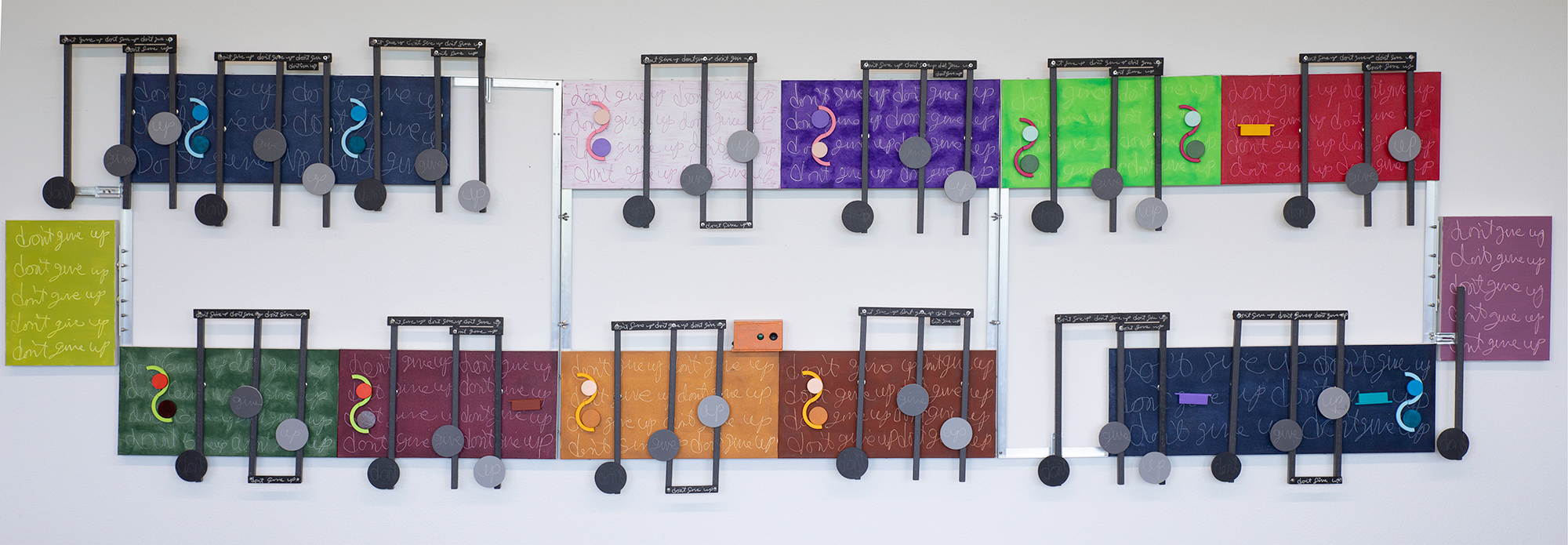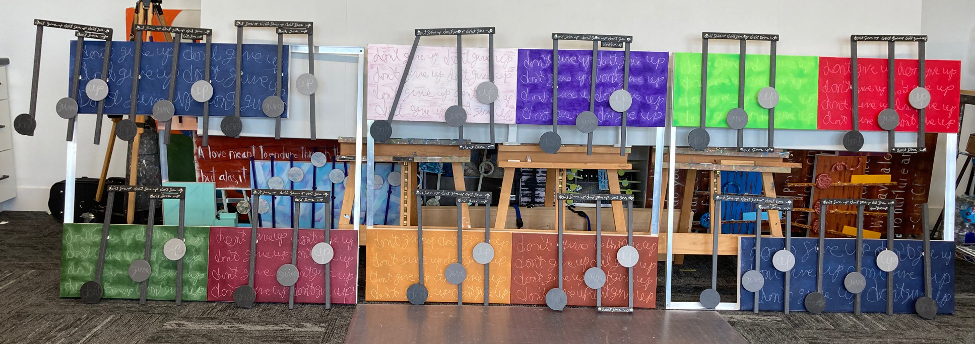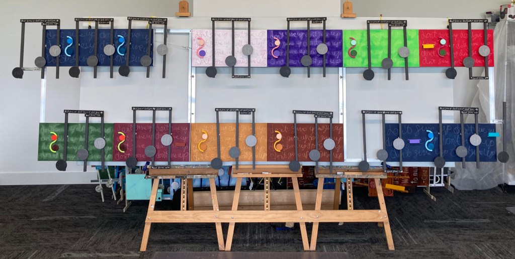 The image from July sixteenth shows the finished structure with all the notation in place with a length of 157 inches and 48 inches in height. Because of the size and weight of this artwork, I have mounted steel plates on the back of all the canvases. In that way, once the artwork is hung, the music with its attached magnets can be easily placed. In the past, I would use other magnets on the back of the canvas to attach the music. This worked, but there were issues when adjusting the music. The magnets on the back of the canvas can easily fall off. This made replacement difficult unless the artwork was removed from the wall.