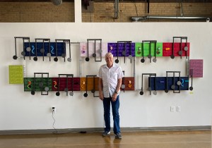 This is the artwork now hanging at The Art Garage in Green Bay, Wisconsin. The hanging, with the help of my wife Barb, went quickly and smoothly. We only forgot to check the works level, which I see is off a bit. We will correct at the reception on August 11th. This artwork is part of an exhibition of EmptyWallsArt. The rest of the members will “caravan” it over to Green Bay on Friday the 4th. Don’t Give up along with many other 3D works by the members will be on show until September 2nd.