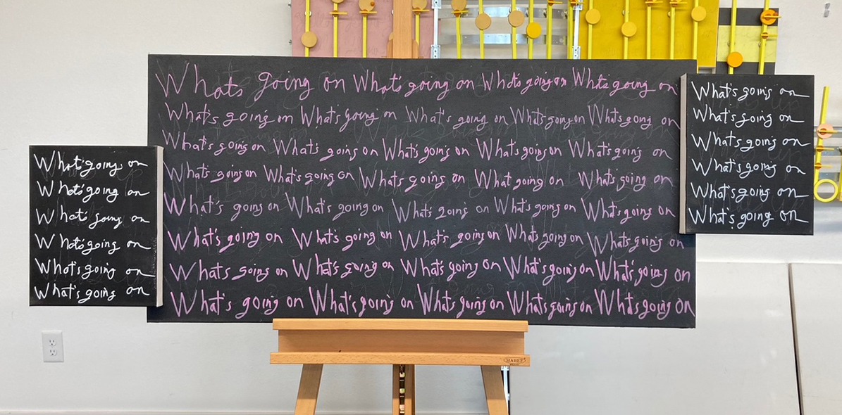 The best way to write the words in a spontaneous way, is in a cursive style. In the past, the only way I have displayed words has been in the print style. Although for me, writing words in a fluid quick motion using acrylic paint was a skill I lacked. The only option that came to mind, and I used with Don’t Give Up, was to scratch the words into the freshly applied layer of paint, using the end of a wider rounded paint brush. That actually worked well. Later I lightly glazed over the words to reduce their contrast. That same technique is what I first did with this current project using the words what’s going on. These three common language words from the lyrics are part of the sample that is the visual part of this artwork. Then I had another idea. Doing some art research, I found a set of acrylic pens that are hopefully archival. I then heavily glazed over my scratched in version to reduce contrast. That is when the fun began. I wrote with little effort only my previous wording of what’s going on, with a brighter, mostly legible cursive writing in a pink version of what’s going on. That color choice comes from the songs four non-blondes band. Finally, I didn’t and don’t care how pretty or poor, sloppy, or illegible my cursive writing looks. The viewer can simply see the pink color as powerful words or an abstraction if they so wish. Plus, my writing looks definitely human and a demonstration of what makes this art me and no one else. A lot of all of today’s art lacks originality, replaced with a colorful look that is so finely and perfectly finished that it loses any feel of being created by a human. Instead, it’s art that looks pretty to be pretty, prostituting itself for the quick stranger sale.