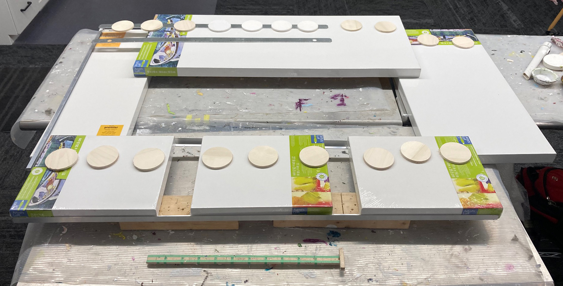 Over the years of painting music the primary requirement of the background was that it was long enough to support all the cover music notes that I was sampling. Then, in 2022, there was a noticeable change in my backgrounds. I wanted more depth in my work to truly separate my music notation from the flat two dimensionality of sheet music. I also felt that having my notation move out and back toward the viewer would better resemble the multi depths in the music’s sound. To help reach my artworks out from the wall, and also accommodate the speaker boxes, one simple technique I taught myself years ago was to stack my background canvases. The 2022 artwork, Crazy, is a good example of what I learned back in 2012. It was my Vivaldi’s Four Seasons series of thirteen very large artworks that I prominently developed this technique.