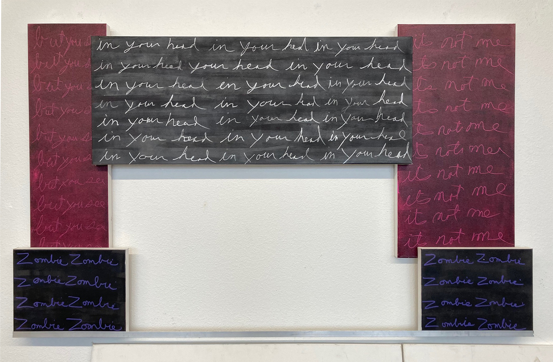 For this work I am using four different generic phrases that I found in the lyrics. I build their value on their repetitiveness. The viewer can either relate them to the original music, or let the repeating message they each represent mean whatever. For me I like the presenting my individual cursive style, that is or is not legible. That I couldn’t care less. My scribbling is fun, adds character and interest, and also depth to these artworks. What I write on these artworks directly connects me, and only me, to these paintings.