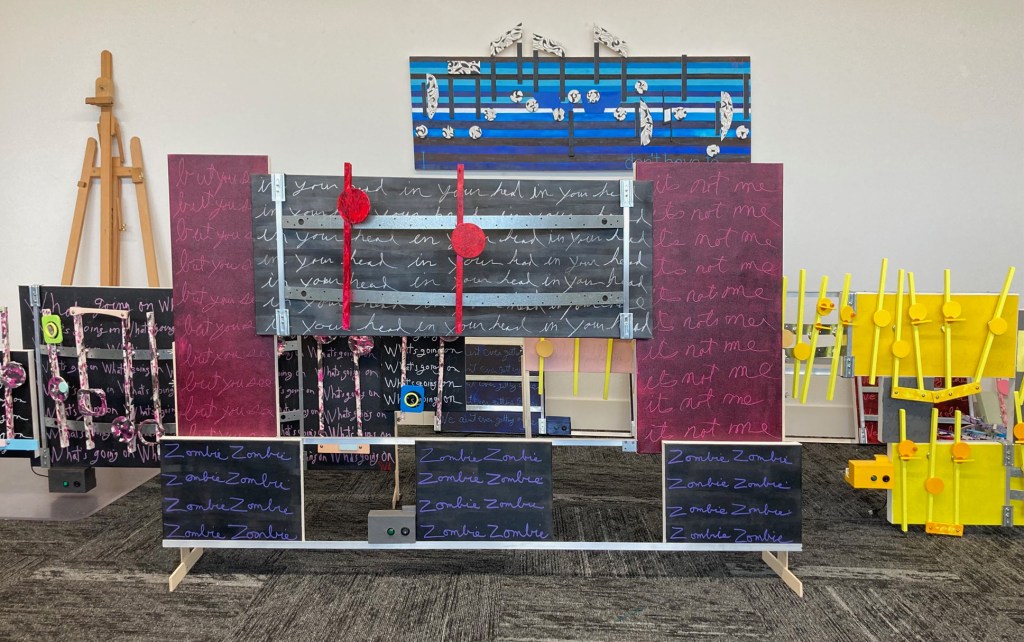 I have properly connected the background canvases for hanging. I have also mounted the challenging handmade music control box, and attached the storage stands. The image above also documents the other in studio artworks that I use for reference. Besides Zombie, the artwork What’s Up is on the left. The artwork Closer is up against the back wall. The work Yellow is on the right, and the 2016 Waylon Jennings music Waymore’s Blues hangs on the back wall.