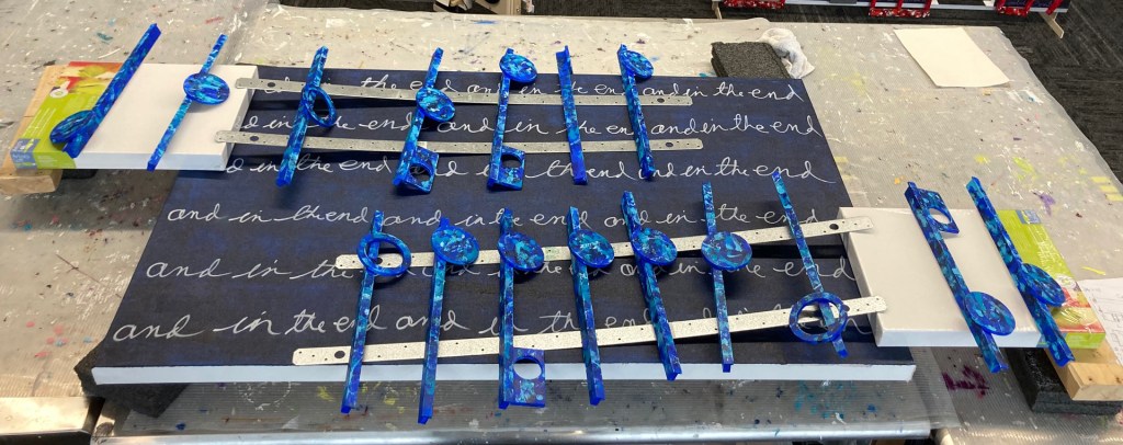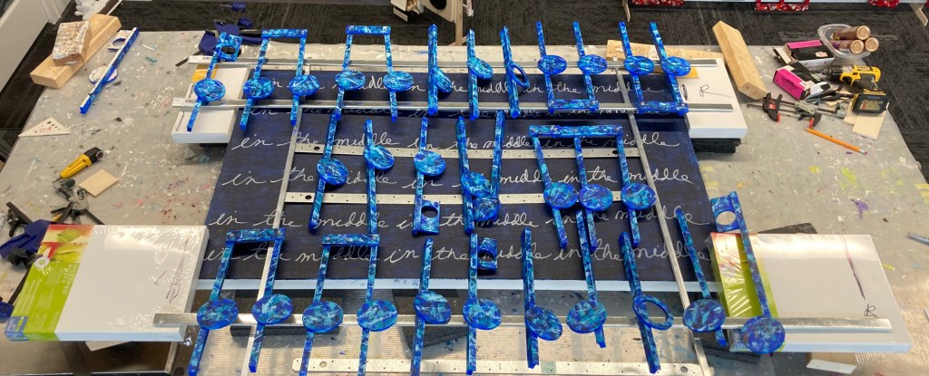 In the past, I have worked on one project at a time from start to finish. Every new music box project begins with the creation, in PerSonus Notion, of a draft cover of the music. I then take my cover sheet music and chose the sample that would be the worksheet for portraying the music. I did not do that with this project. Instead, I first put together the worksheet sample for each of the artworks. This change came about when I decided I needed to build all three artworks together. I decided that each would share a common design, the same use of color, and other visual features. This came about because of time constraints needing all three completed by the coming mid to late January. That then pushed me to get this multiple project going, knowing that the cover music was secondary to the need to have completed artworks. Currently already deep into this project, the time line looks a lot better. I believe now that I will have both the artworks and their music boxes completed before they’re hanging in January.