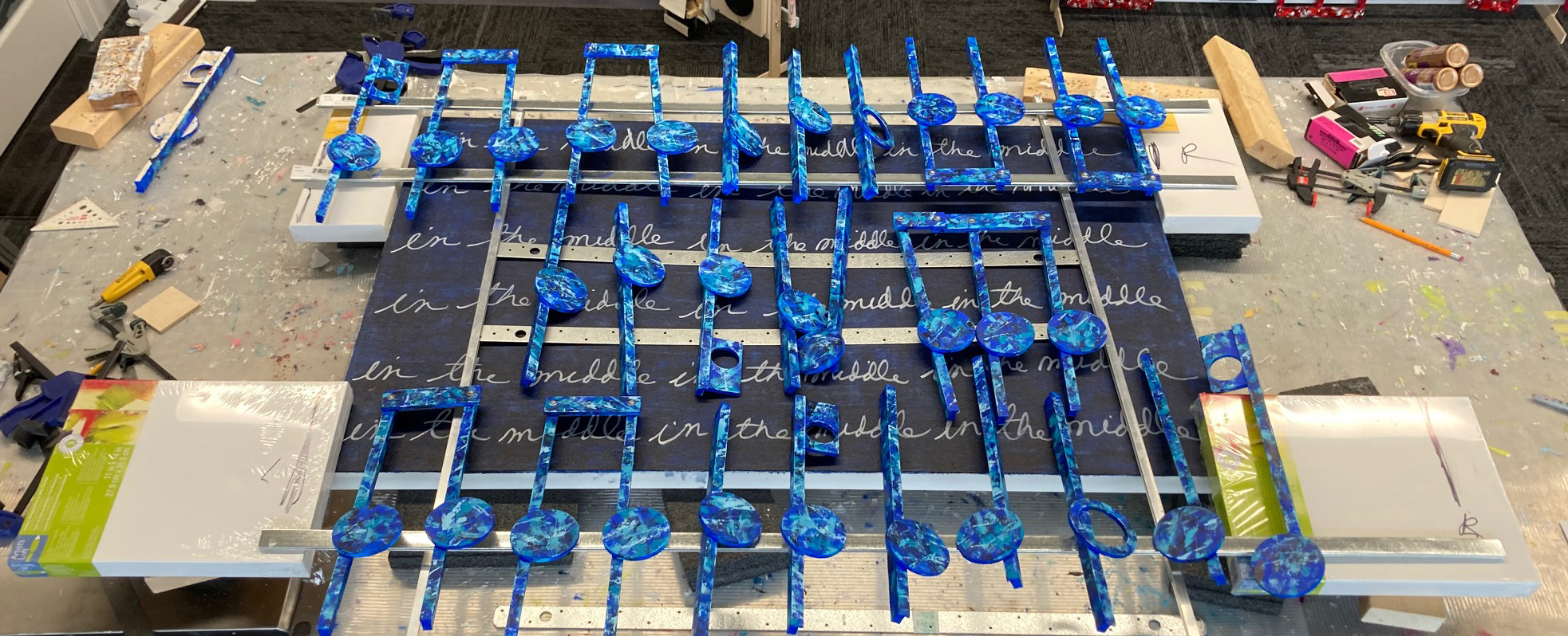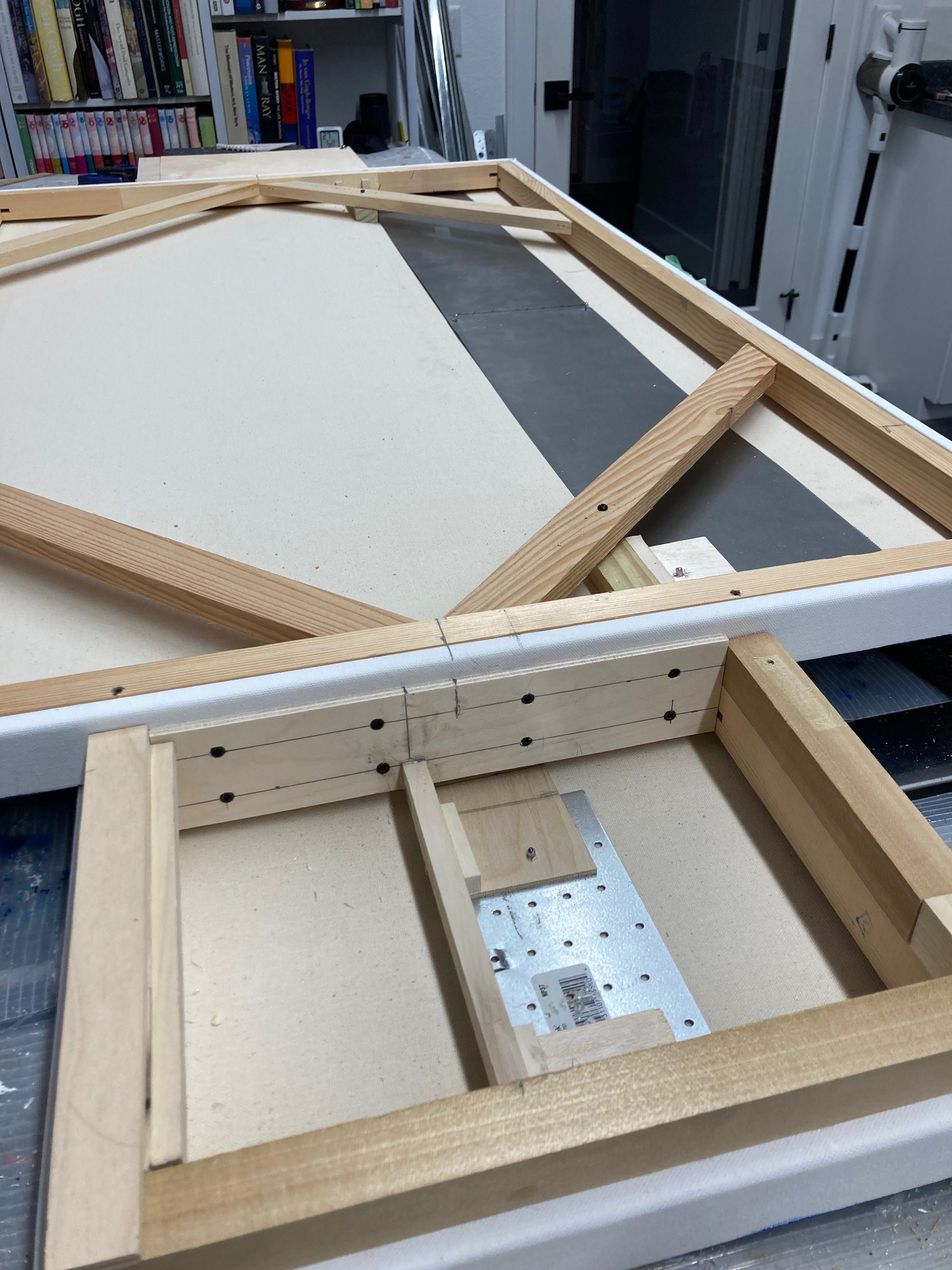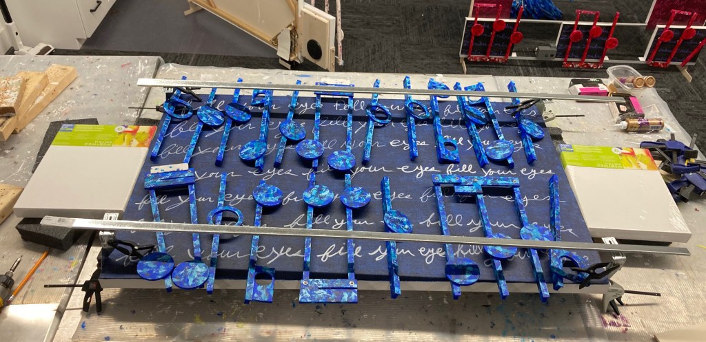 Currently, I am working on the backside of the artwork Golden Slumbers. The image below shows the installed steel plates across the top side of the artwork and in the speaker box. From the layout seen above for Golden I have added to both speaker boxes a steel plate to move two notes from each row off the main canvas. I had to do this after using the arrangement of the layout. I realized that twelve notes across a thirty-six inch canvas would be a tight fit.